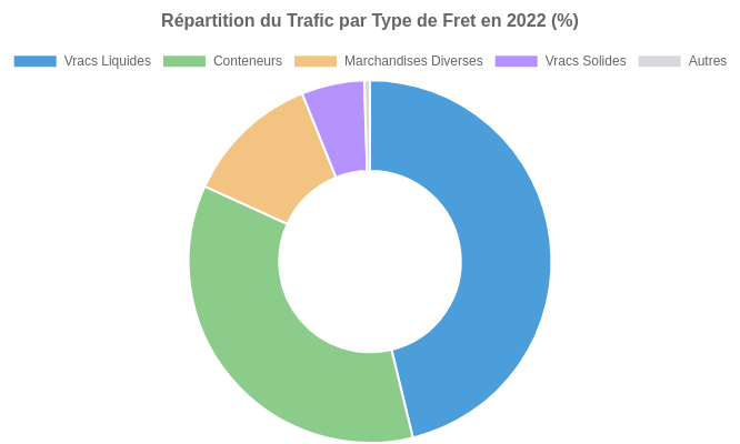 La structure du trafic confirme la domination du pétrole (vracs liquides = 46% du tonnage en 2022).
